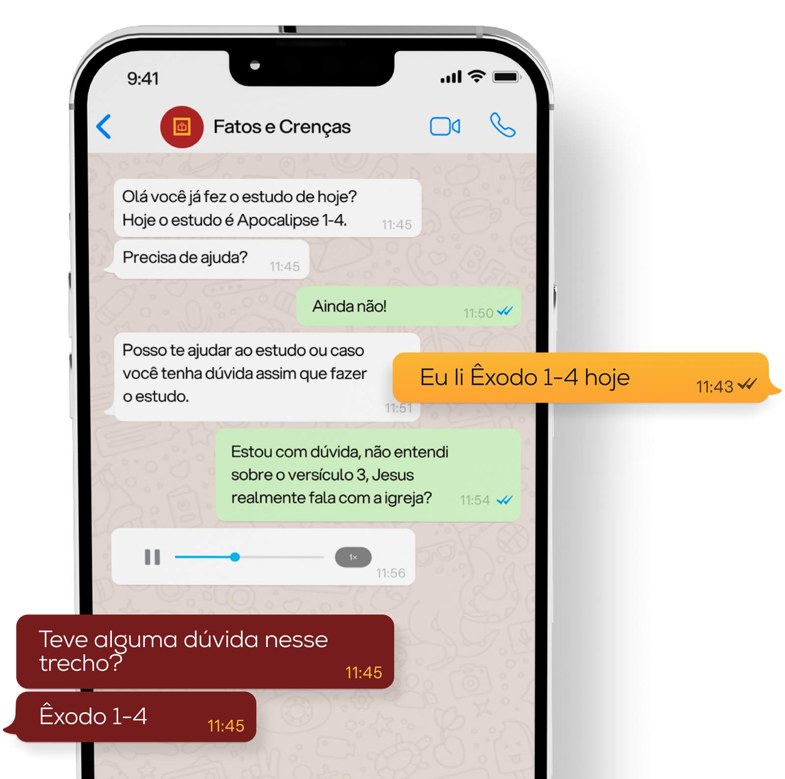 A Fatos e Crenças conta com uma IA pensada para o estudo bíblico. Todos os dias, ela interage com você: pergunta se você leu, oferece resumos quando necessário e responde dúvidas sobre os versículos.